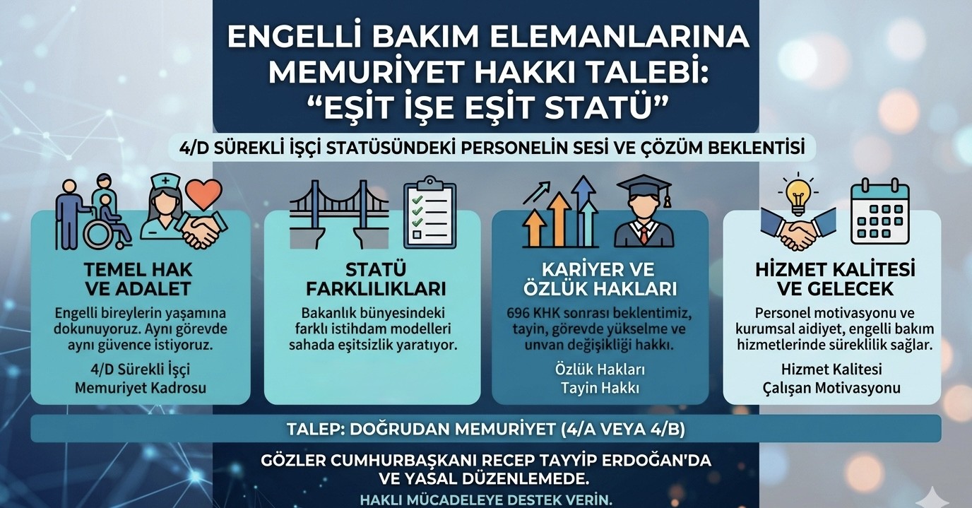 ANKARA - 09.04.2026 – Aile ve Sosyal Hizmetler Bakanlığı (ASHB) bünyesinde büyük bir özveriyle görev yapan engelli bakım elemanları, çalışma koşullarındaki statü farklılıklarının giderilmesi için yetkililere sesleniyor. Sahada aynı işi yapmalarına rağmen 4/D sürekli işçi statüsünde istihdam edilen personeller, "Eşit işe eşit statü" ilkesi gereği memuriyet hakkı talep ediyor.