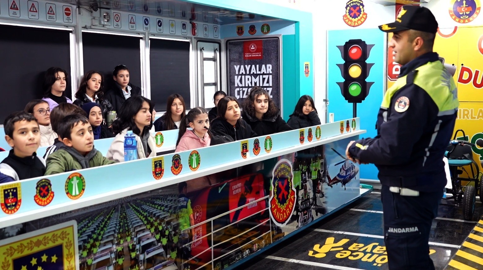 Mobil eğitim tırında jandarma personeli tarafından öğrencilere trafik kuralları hakkında bilgiler verildi; eğitici çizgi filmler ve videolar izletildi. Ardından çocuklar, özel olarak trafik işaret ve levhalarıyla dizayn edilen platformda pedallı araçlara binerek trafik ışıkları ve işaretlerinin anlamlarını uygulamalı olarak öğrendi. Jandarma görevlileri koordinesinde gerçekleştirilen uygulamalarda güvenli sürüş kuralları detaylı şekilde anlatıldı.