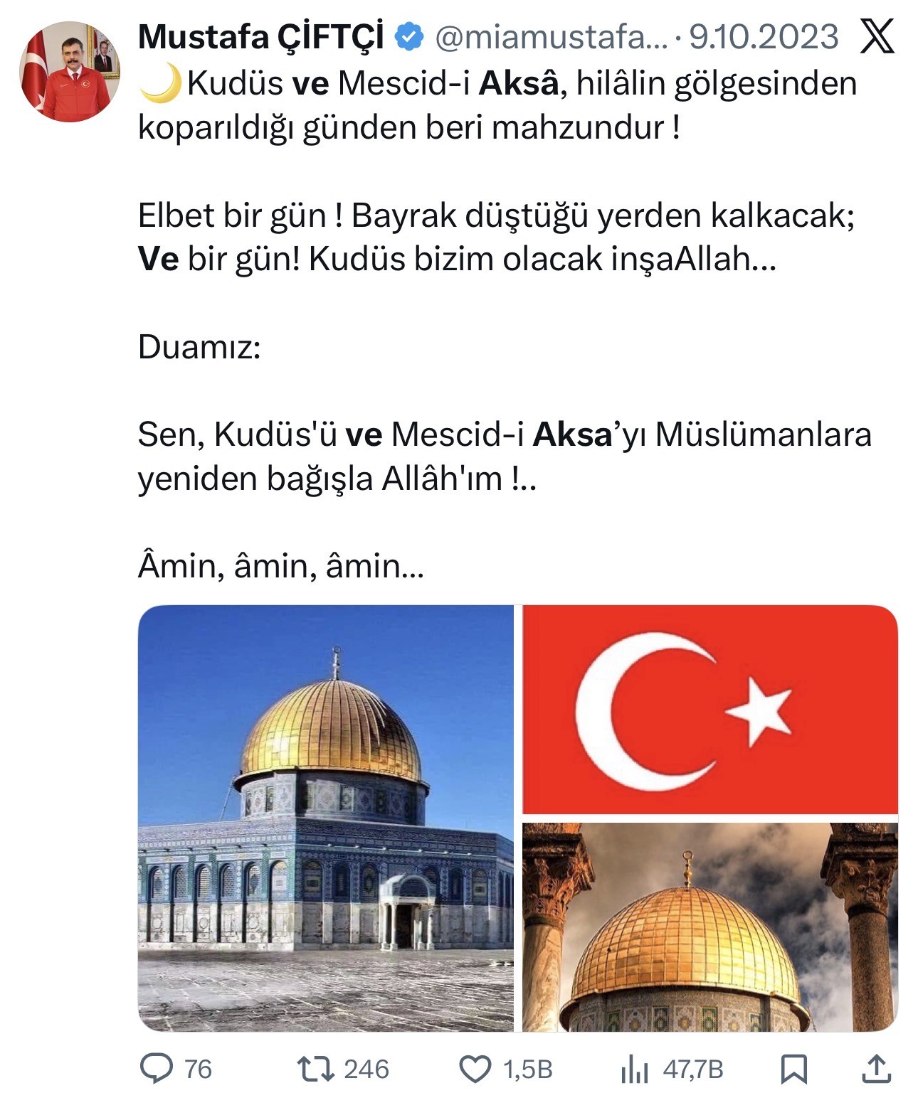 Paylaşımda Kudüs, Kubbetü’s-Sahra ve Türk bayrağı görsellerine yer verilmesi de dikkat çeken unsurlar arasında gösterilirken, Çiftçi’nin geçmişte dile getirdiği mesajın yeni görev süreciyle birlikte daha geniş bir kesim tarafından konuşulduğu değerlendiriliyor.